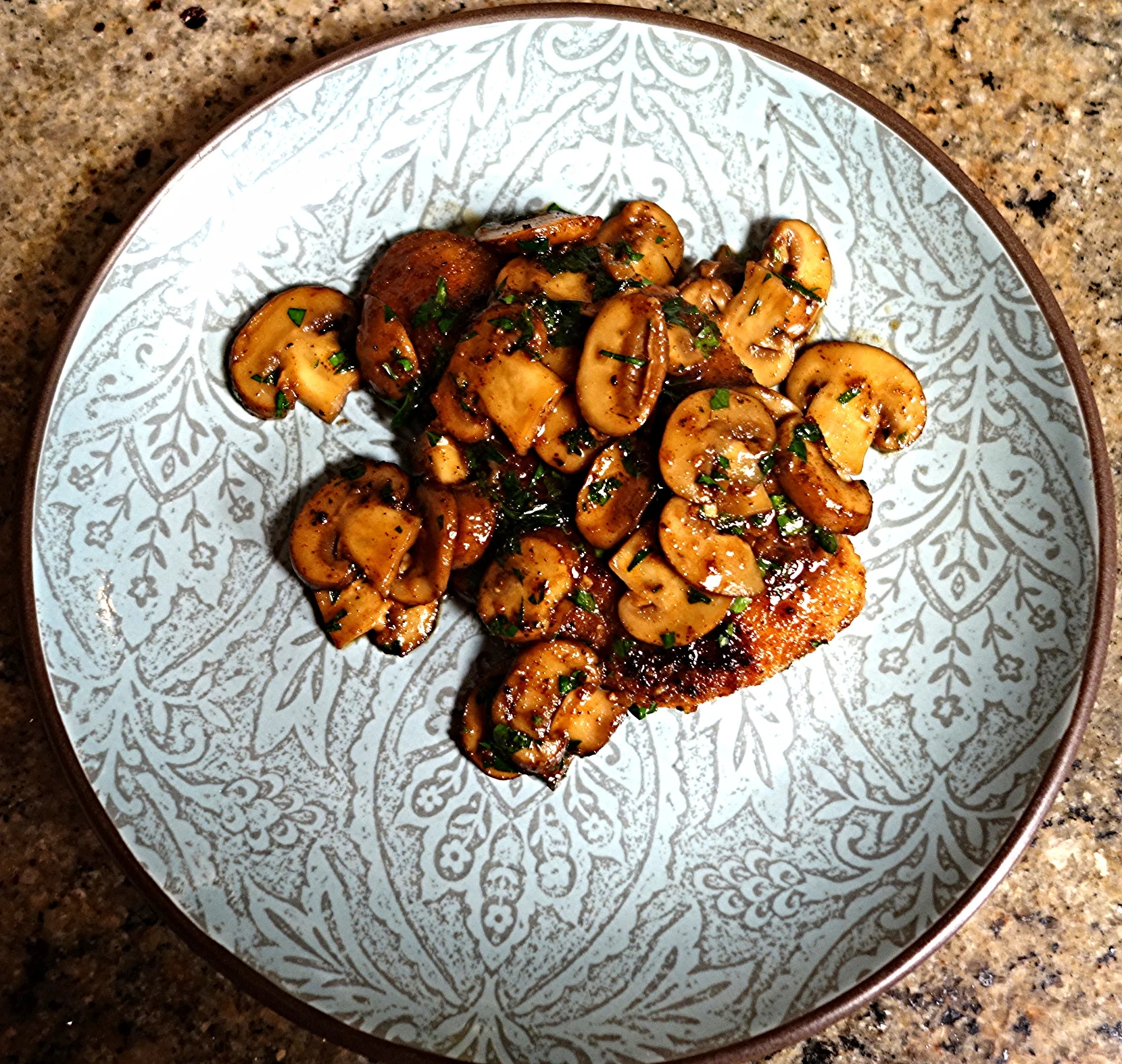 When all of the cutlets are cooked, return the pan to the heat and add in the mushrooms. Allow to cook down for 5 minutes. Season mushrooms with salt and pepper. Add cutlets back into pan on top of mushrooms. Pour marsala wine over chicken and mushrooms. Bring to a brief boil and then allow to simmer altogether for another 5 minutes or until sauce thickens. Top with fresh parsley and serve hot.