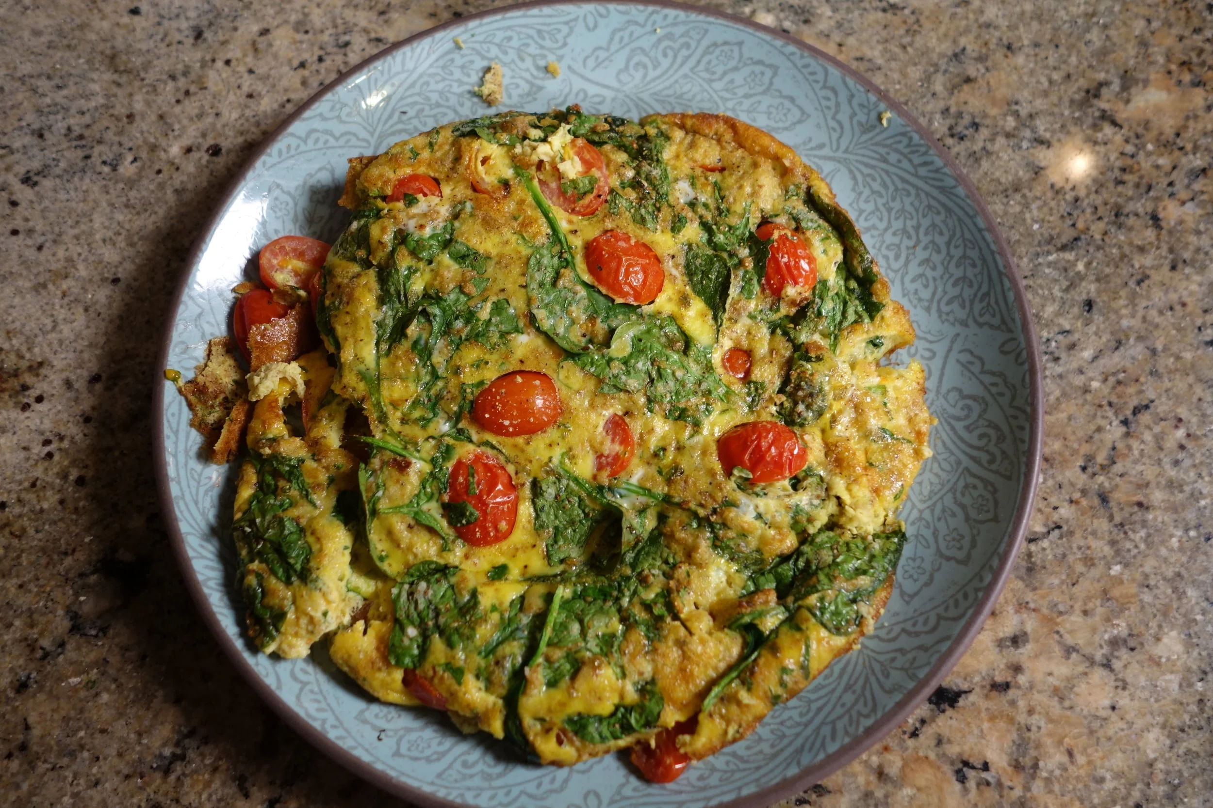 Add spinach to eggs. Halve tomatoes and add to eggs. Mix well.